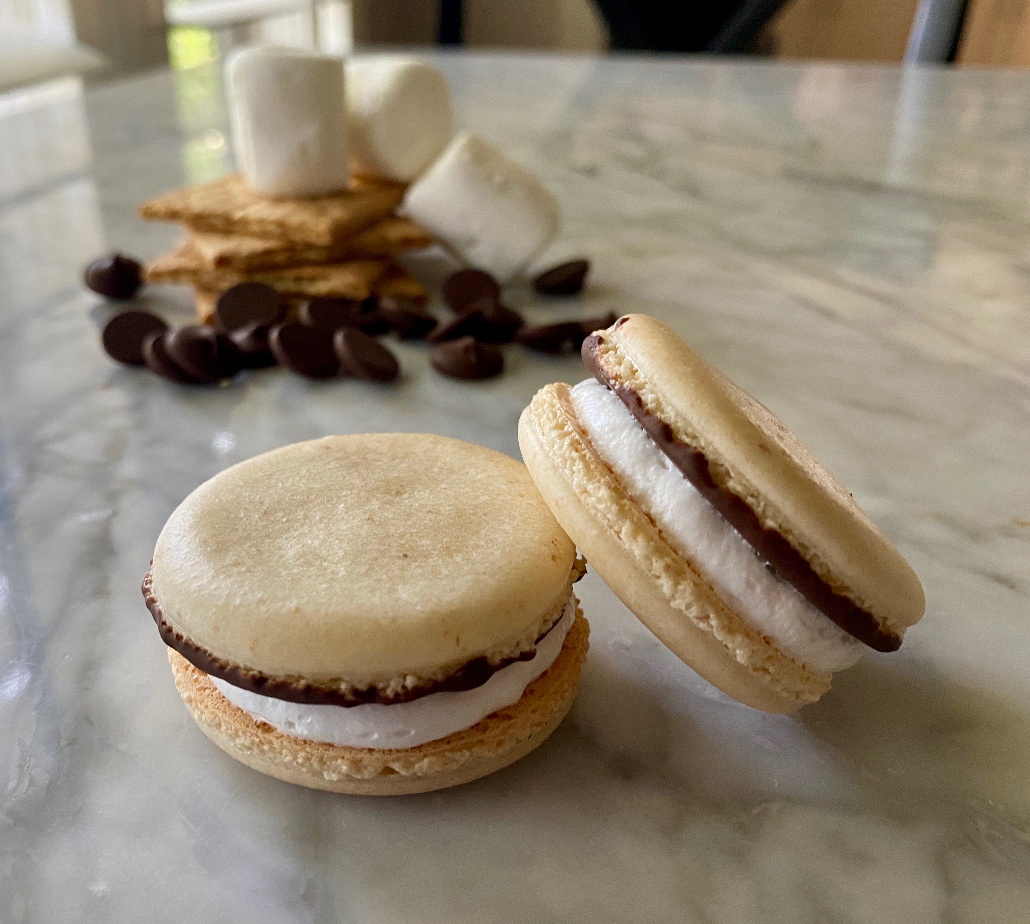- Transfer marshmallow frosting to a piping bag fitted with a 1A piping tip. Pipe the other half of the macaron shells with the filling. Sandwich them with the chocolate dipped ones.